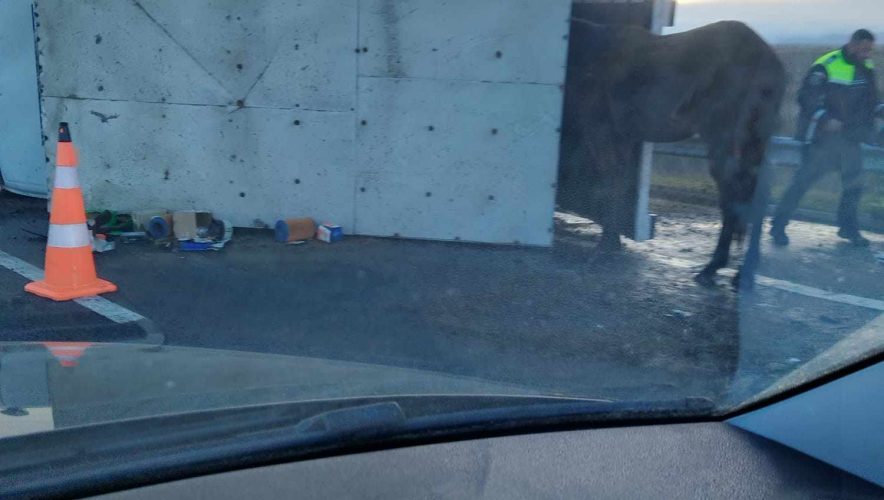 Traficul este blocat la ieștirea din Arad spre Timișoara după ce un autoturism s-a tamponat cu un camion care transporta animele (cai). Polițiștii se află la fața locului pentru a stabili cauzele accidentului.