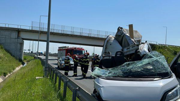 Un grav accident de circulație a avut loc, luni, pe autostrada A 1, sensul Timișoara – Arad. Șoferul unei dubițe care a izbit din spate un TIR a fost rănit. O bucată din cabină, cu tot cu portiera a rămas înfiptă în autotren.
