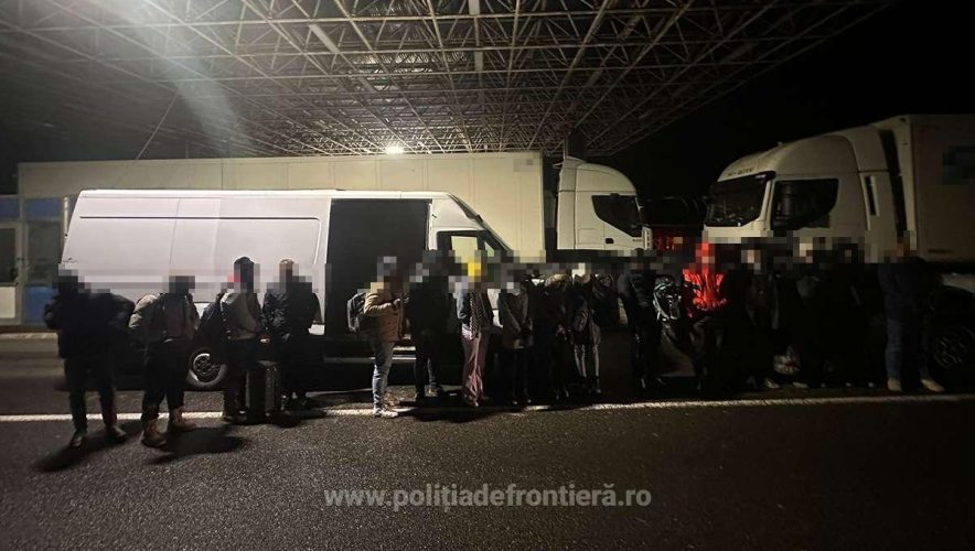 Poliţiştii de frontieră arădeni din cadrul Punctului de Trecere a Frontierei Nădlac II au depistat 104 de cetăţeni din diverse state care au încercat să treacă ilegal frontiera în Ungaria, ascunşi în trei TIR-uri și o autoutilitară. Se fac cercetări sub aspectul săvârşirii infracţiunii de trafic de migranţi pentru şoferii mijloacelor de transport şi tentativă de trecere frauduloasă a frontierei de stat pentru cetăţenii străini descoperiţi.