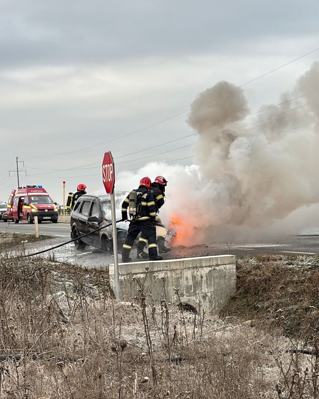 Incendiul se manifestă prin ardere generalizată la autoturism.