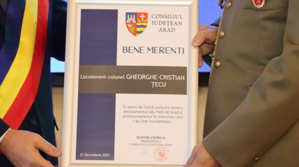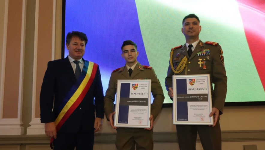 Președintele Consiliului Județean Arad a decis să acorde astăzi Distincția Bene Merenti pentru atitudine, perseverență, rigoare, pentru cei care poartă uniforma în suflet și în sânge. Distincția Bene Merenti a fost acordată celor doi militari în semn de înaltă prețuire pentru devotamentul lor față de Arad și profesionalismul în misiunile care le-au fost încredințate, pentru implicare civică și socială în proiectele comunității arădene.