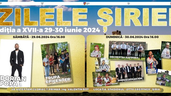 Zilele Șiriei au loc în acest sfârșit de săptămână, respectiv sâmbătă și duminică, în 29 și 30 iunie. Organizatorii au pregătit un program complex, care începe sâmbătă la ora 16.00 cu Concursul Național de Interpretare a Muzicii Vocale Românești „Emil Monția“ – canto muzică tradițională. Acompaniază Orchestra Rapsodia, conducerea muzicală aparținându-i profesorului Vasile Rus. Evenimentul se va desfășura pe Stadionul…