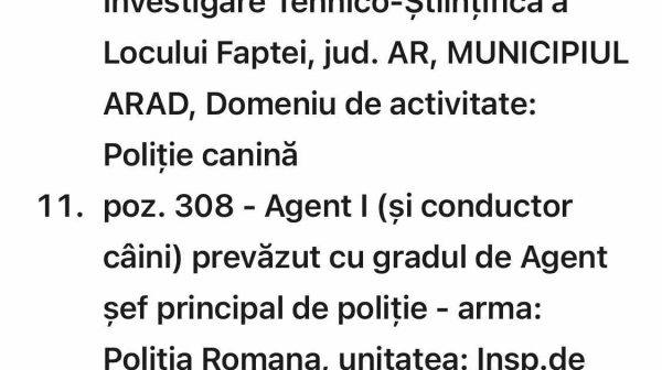 Inspectoratul de Politie Judetean Arad organizeaza recrutare pentru ocpuarea a 2 posturi vacante de agent de politie (conductori caini) din cadrul Serviciului Criminalistic. Inscrierea candidatilor se realizeaza exclusiv online la adresa e-mail sursaexterna@ar.politiaromana.ro, prin transmiterea documentelor conform regulilor precizate in anuntul de concurs, pe care il regasiti in linkul de mai jos.