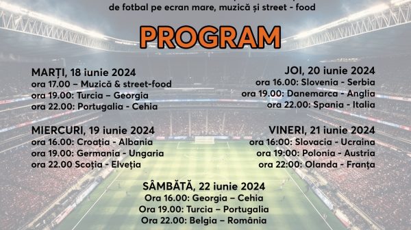 Arădenii vor putea să urmărească și în această săptămână, în aer liber, meciurile de la Campionatul European de Fotbal din Germania, pe ecranul de mari dimensiuni, care este amplasat în Piața Catedralei.Astfel, microbiștii și nu numai sunt așteptați în zona care este special amenajată în Piața Catedralei, de marți 18 iunie 2024 până sâmbătă 22 iunie, 2024 cu fotbal, muzică și street-food. Programul transmisiunilor va continua și în zilele următoare, programul urmând să fie anunțat zilele viitoare. Menționăm că începând de duminică, 23 iunie, la EURO 2024 au fost programate câte două meciuri la aceeași oră, urmând ca în Piața Catedralei să fie vizionat meciul care va fi difuzat de postul PRO TV. Evenimentul este organizat de Primăria Municipiului Arad prin Centrul Municipal de Cultură Arad.