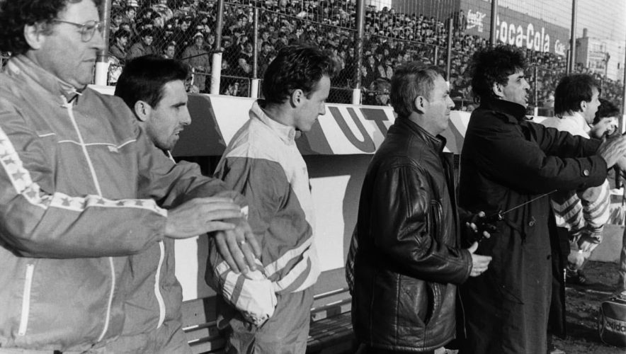 * În fotografia realizată de Viorel Musca pe 22 martie 1995, UTA reușea o victorie de senzație în fața Rapidului, 1-0 cu gol marcat de More Târțău. Pe bancă, antrenorul Gigi Borugă, secondat de Ladislau Korossi, au trăit intens mai ales minutele de final