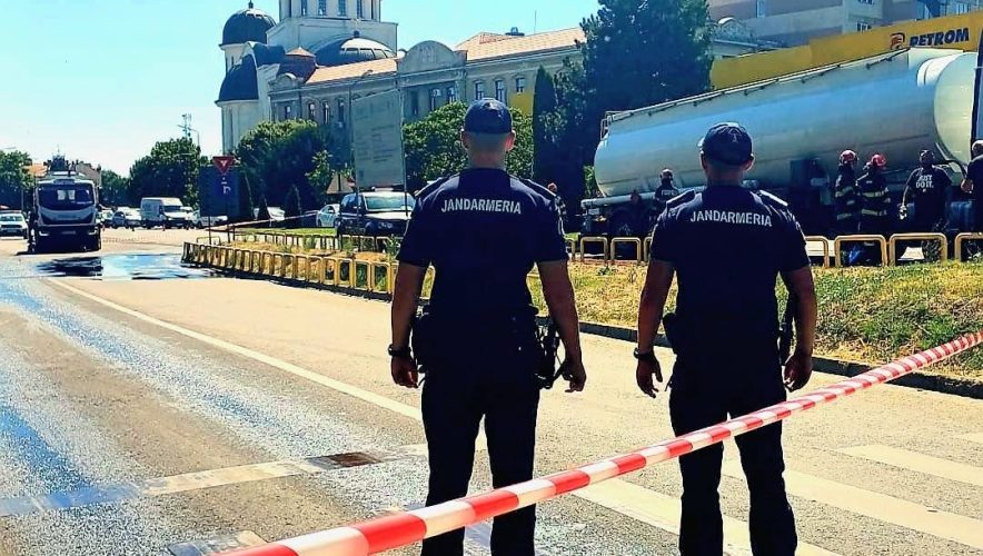 Jandarmii au fost prezenți în Zona Podului Grădiște, unde a avut loc un accident între o cisternă încărcată cu combustibil și un autoturism. Cisterna a fost avariată, existând scurgeri de combustibil.