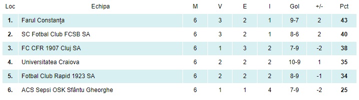 Formula aleasă de specialiștii LPF reflectă destul de bine lucrurile importante care s-au petrecut în această etapă. În play-off FCSB a scos-o definitiv din lupta pentru titlu pe Universitatea Craiova, Rapid și Sepsi le-au învins respectiv blocat pe CFR și Farul iar în play-out Petrolul și-a asigurat salvarea matematică de la retrogradare în timp ce FC Voluntari a băgat-o pe Universitatea Cluj într-o zonă cu pericol de baraj. Iată rezultatele complete și clasamentul: