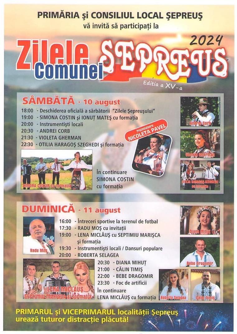 În acest weekend vor avea loc zilele comunei Șepreuș. Deschiderea oficială a evenimentului va avea loc sâmbătă 10 august începând cu 18:00.
