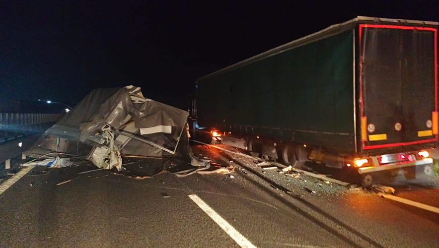 Traficul este blocat în urma unui accident care a avut loc în urmă cu câteva minute. O autoutilitară a lovit un autotren care staționa pe banda de urgență.